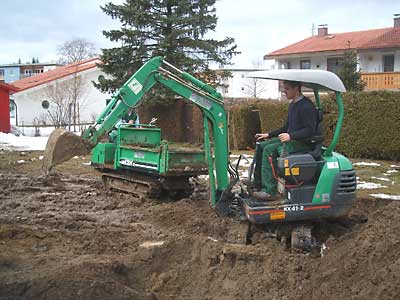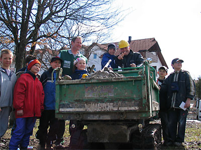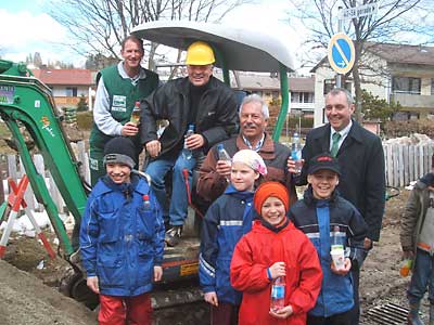 Stephan Lehmann von Antenne Bayern durfte unter Anleitung von Helmut Strahl auch mit dem Bagger fahren. Mit dabei der Bürgermeister Johann Zeh und die „Kinderbauleiter” von Stephan. |