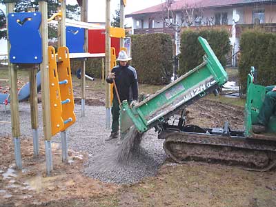 In die ausgebaggerte Fallschutzfläche wird Rollkies als Drainageschicht eingebaut, um das Wasser abzuführen. |